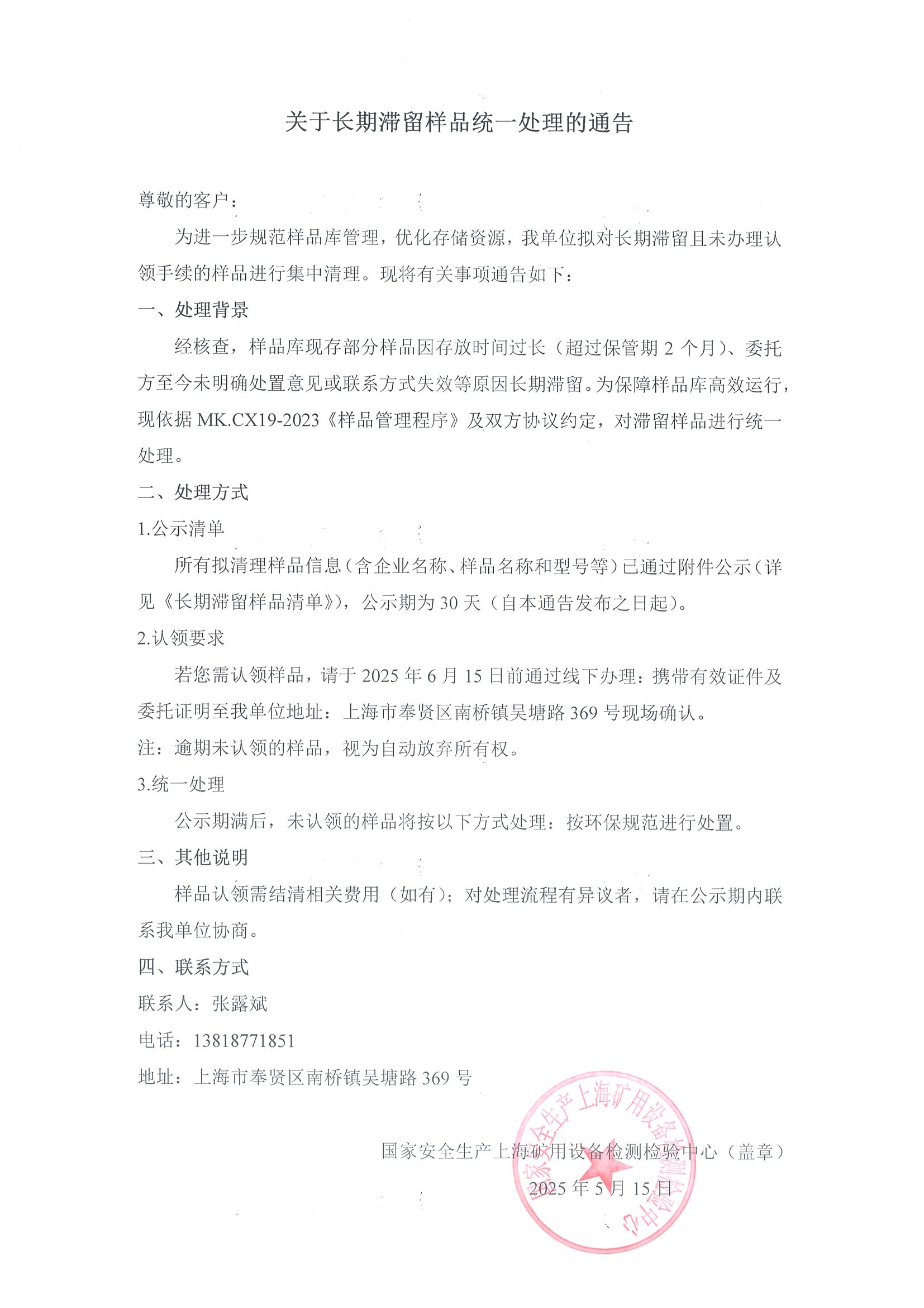 關于長期滯留樣品統一處理的通告