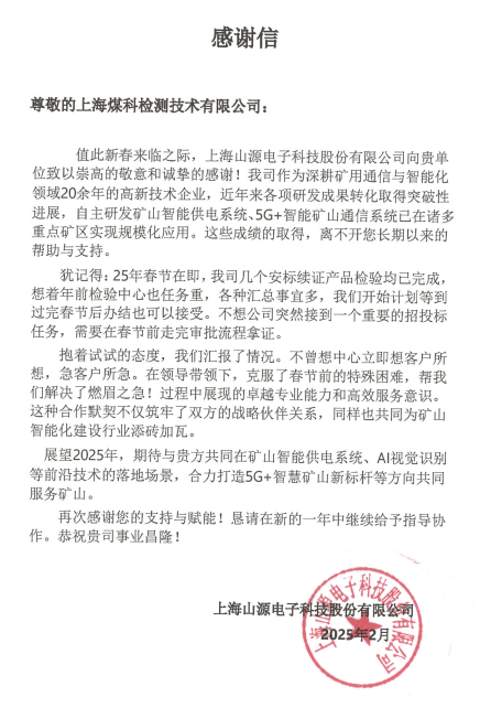 2025年伊始,上海煤科檢測技術有限公司(簡稱檢測公司)連續收到來自華榮科技股份有限公司(簡稱華榮公司)送來的錦旗和上海山源電子科技股份有限公司(簡稱山源公司)發來的感謝信,感謝檢測公司在過去的一年中提供了全面高效的檢測技術服務。